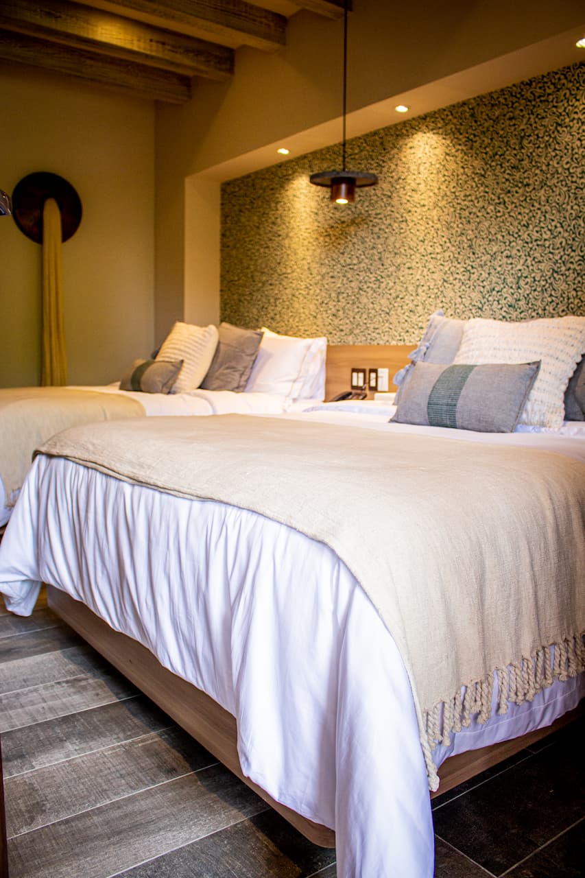 Habitación decorada con un hermoso estilo mexicano con aire acondicionado. Encontrarás dos cómodas camas Queen Size, un escritorio de trabajo, Pantalla de 55" con sistema SKY, closet, baño completo con Regadera tipo lluvia. Amenidades de lujo: pantuflas, bata, toallas de cuerpo completo, de mano y faciales, así como plancha de vapor de mano, secadora de cabello, caja de seguridad electrónica, Nespresso y café de cápsula de cortesía. Teléfono con línea directa, Internet inalámbrico, Sistema de llaves electrónicas y servicio de minibar. Algunas habitaciones cuentan con blacón o con una pequeña sala de estar en terraza con vista a la alberca del hotel o hacia jardines y lago, de acuerdo a su configuración. Algunas de estas habitaciones cuentan con sofá cama adicional.